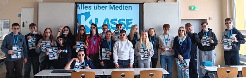 Ab dem 3. November 2025 gehört die Klasse 8b zu den Medienklassen, die am Projekt der Mitteldeutschen Zeitung teilnehmen. Dann heißt es für drei Wochen Zeitungen lesen, erkunden und erfahren. Vorab erhielt die Klasse ein kleines Überraschungspaket mit Presseausweis, Schlüsselband, Stundenplan und einer coolen UV-Sonnenbrille. Darüber freute sie sich sehr.