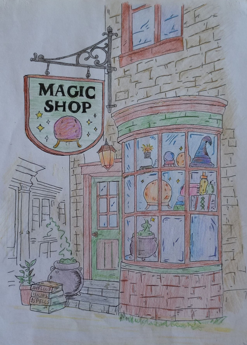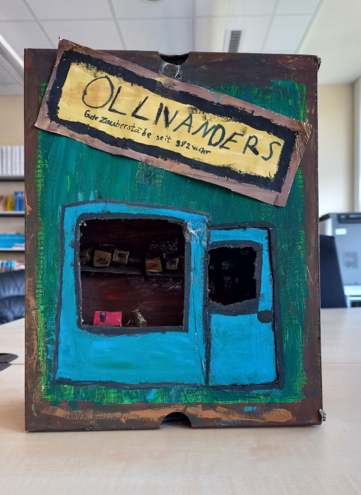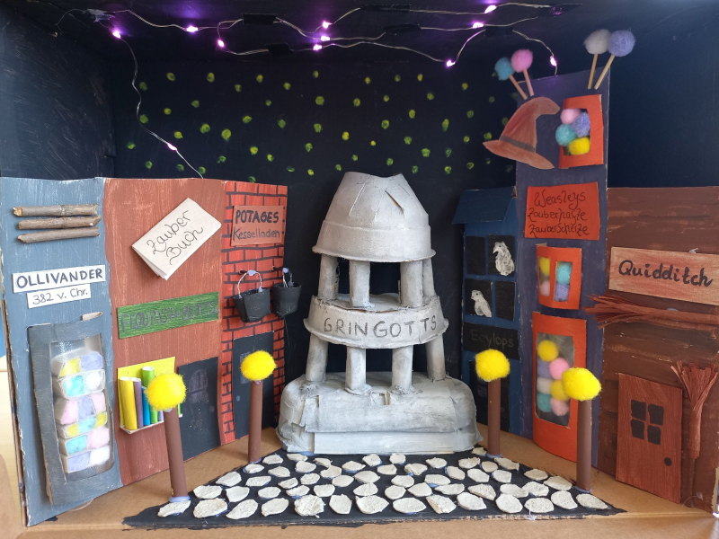 Die Klasse 6b hat eine Kreativarbeit im Deutschunterricht zum Thema Harry Potter gemacht. Dabei hat sie sich sehr viel Mühe gegeben. Die Aufgabe war es, etwas zum Thema Winkelgasse zu gestalten. Es gab viele Möglichkeiten z.B.: