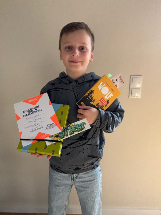 Nachdem ich die Jury beim schulinternen Vorlesewettbewerb im Dezember überzeugen konnte, wurde ich nach Wittenberg zum Kreisausscheid eingeladen. Dieser fand am Dienstag, den 24.02.2026, statt. Angekommen in der Stadtbibliothek, stellte ich zuerst mein vorbereitetes Buch „Wolf“ von Saŝa Staniŝić vor. Nach den Buchvorträgen und einer kurzen Pause mussten alle Teilnehmer eine fremde Textstelle aus dem Buch „Das Hotel im Nirgendwo“ von Mexify vortragen. Bis zuletzt blieb es spannend, da alle Schüler mit großem Einsatz überzeugende Lesebeiträge präsentierten. Am Ende erreichte ich den 2. Platz und erhielt als Auszeichnung das ausgewählte Preisbuch des diesjährigen Vorlesewettbewerbs.